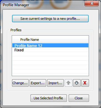 Show the Profile Manager dialog. Profiles save all current settings to a